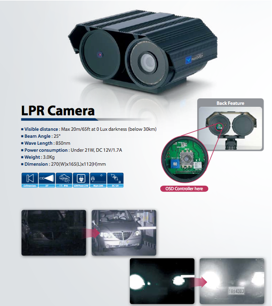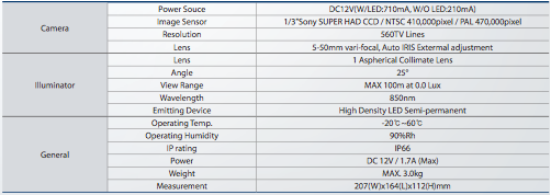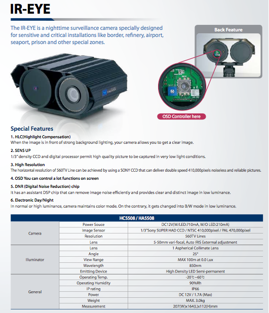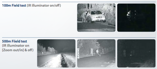 Left top a camera with integrated special IR led lamp.Range is max 100 mete with integrated led unit. If we add exta led lamps as showed on top ight images we can do 500 meter in visible range.
