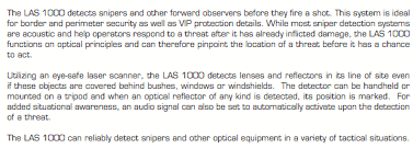 This is a very såpecial sensor / camera that is designed to detect anyone that looks at you with a binocular / telescopic sight or electro optical assembly at short to long range., System operates day or night and is a hand held stand alone system. Range is up to 1000 meter to a binocular system.